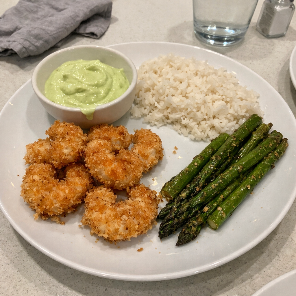 Crevettes enrobées d'une chapelure panko extra croustillante, servies avec des asperges rôties et une trempette onctueuse à l'avocat et crème sure au citron. Un repas amusant pour toute la famille.