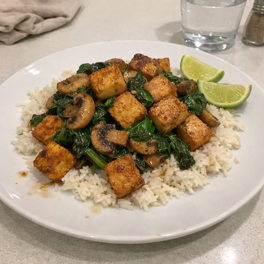 Un sauté végétarien savoureux et nourrissant. Le tofu ferme, pressé puis poêlé jusqu'à obtenir des faces croustillantes, est combiné aux épinards frais, aux champignons cremini et à une sauce légère au soya et lime. Servi sur riz basmati pour un repas complet.