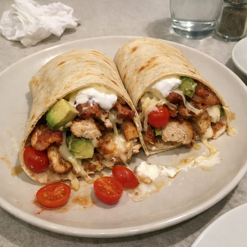 Un wrap généreux et satisfaisant avec du poulet grillé juteux, du bacon croustillant, de l'avocat crémeux et de la mozzarella fondante, relevé de tomates raisins et d'une touche de crème sure.